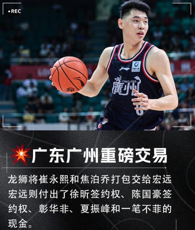 此前CBA诞生一笔重磅交易,广东队用徐昕签约权、陈国豪签约权、彰华非、夏振峰、一笔不菲的现金,从广州队交易来崔永熙和焦泊乔。