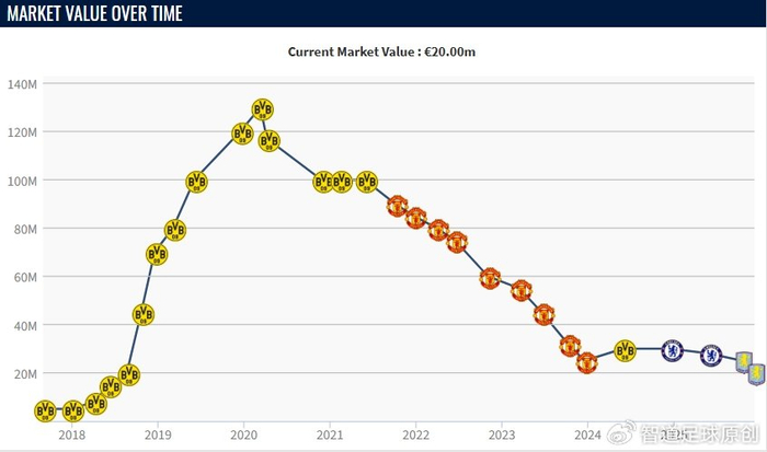 桑乔出自曼城青训,在多特蒙德成为德甲大杀器,能传能射,高价回归英超加盟曼联之后就沦为平庸。桑乔19岁时身价高达1.3亿欧元,是名副其实的亿欧先生,如今25岁原本是球员的黄金年龄,但身价已经剩下不足巅峰期的1/6了,只能说一声叹息。桑乔与曼联的合同本赛季结束后到期,下一站会是哪里呢?桑乔还有职业生涯第二春吗?