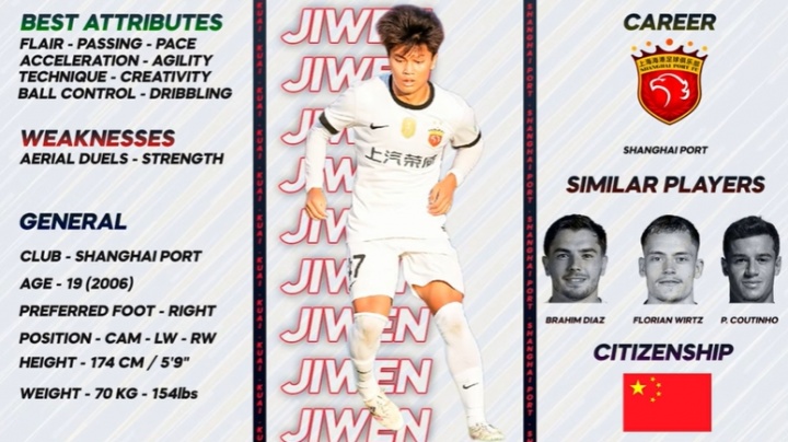 视频中,该博主列出蒯纪闻的优势为:天赋、传球、速度、加速、敏捷、技术、创造力、控球、盘带。弱势则是空中对抗和力量。博主还给出了蒯纪闻的三个模板球员:布拉欣-迪亚斯、维尔茨和库蒂尼奥。