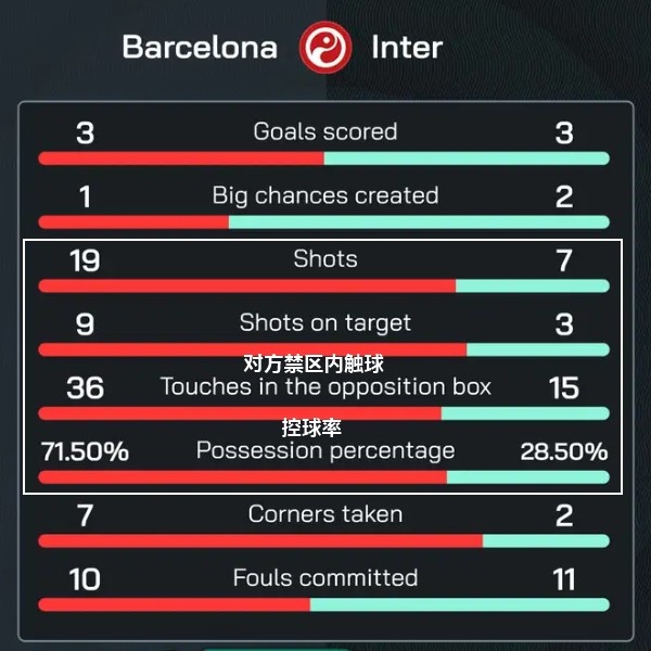 从首回合统计数据也能看到,巴萨控球率高达71.5%,在对方禁区内触球次数是国米的2.4倍,射正数9比3,但是国米的射正全部收获进球。
